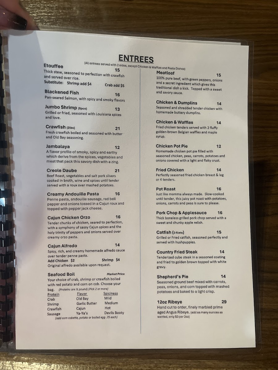 Ya-Ya's Sea And Soul Food offers a diverse and vibrant menu that caters to a wide range of tastes and preferences. From comforting appetizers like Deep Fried Deviled Eggs (8) and Crab Dip to unique desserts such as Cheesecake and Salted Caramel Bacon Waffle, the restaurant promises something for everyone. If you're craving something more substantial, their Entrees section stands out with flavorful dishes like Shepherd’s Pie, Etouffee, and the hearty Pot Roast.