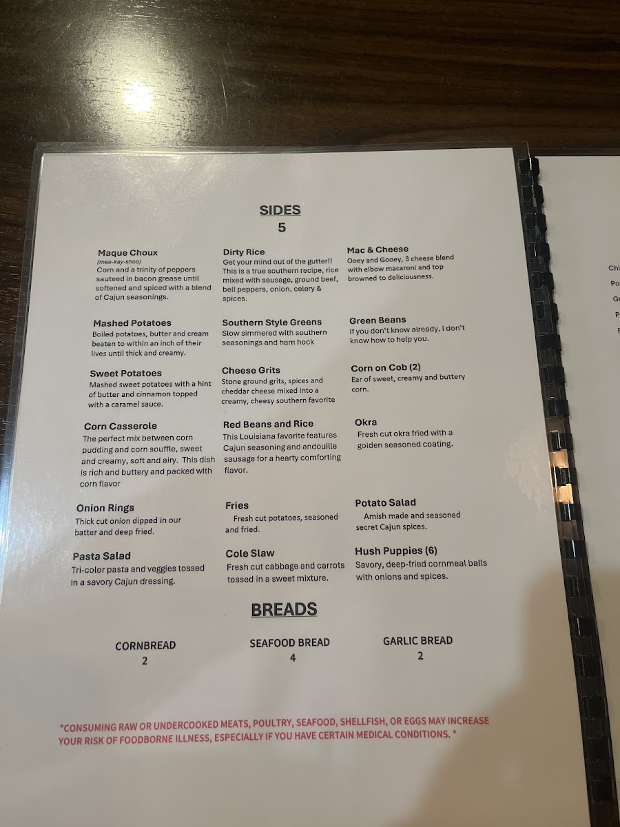 Ooey and Gooey, 3 cheese blend with elbow macaroni and topped with bayou dust. It can be baked for $2 extra.